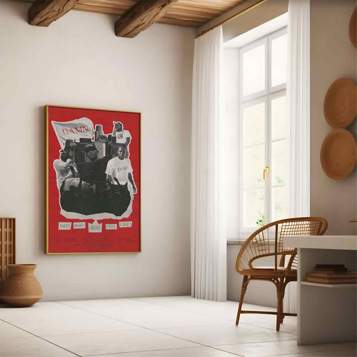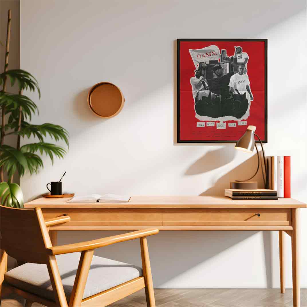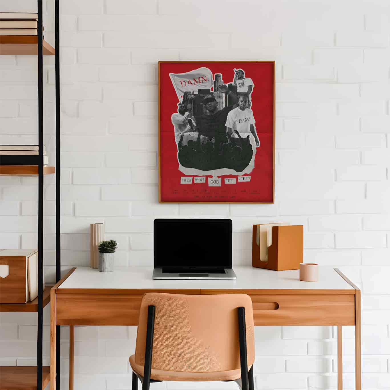 Showcasing powerful visuals from Kendrick Lamar's DAMN. era, this bold collage poster features iconic imagery, including live performances, urban backdrops, and the signature "DAMN." flag, all set against a striking red background. Perfect for fans of conscious hip-hop, this album art print captures the raw energy and emotion of Kendrick's Pulitzer Prize-winning masterpiece.