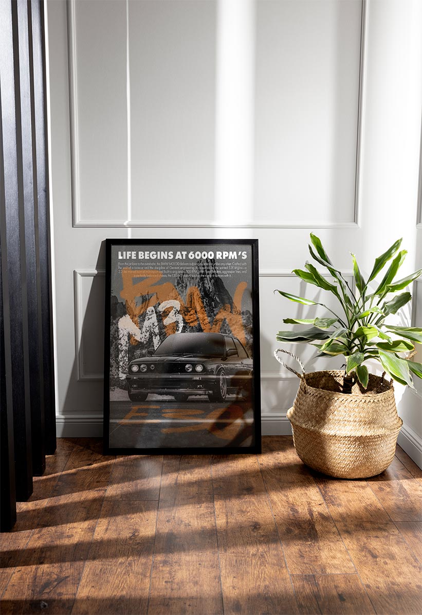 Bring the thrill of motorsport home with this BMW M3 E30 Vintage Poster, showcasing the iconic E30 M3 under bold typography and gritty street-inspired graphics. Featuring the tagline “Life Begins at 6000 RPM’s” and a striking black-and-white aesthetic, this poster is perfect for any true BMW enthusiast’s wall.
