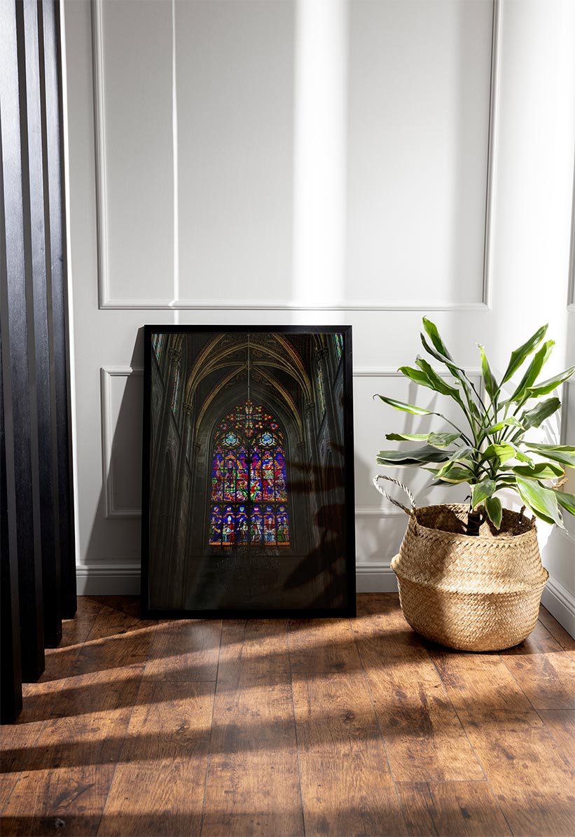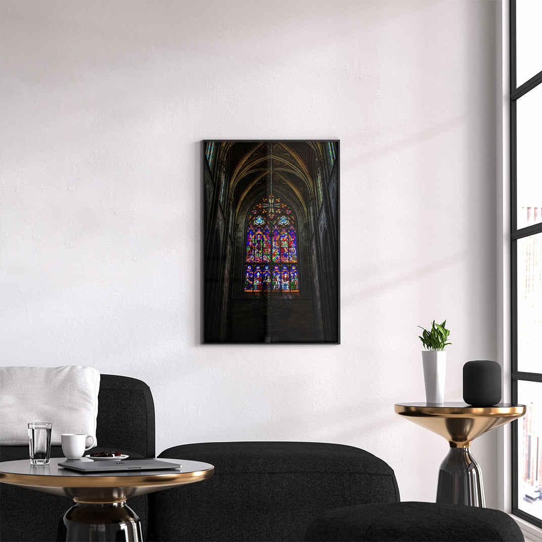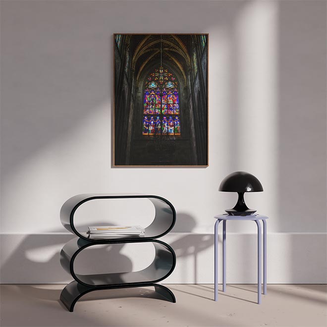 Bathed in the glow of centuries-old stained glass, this awe-inspiring Austrian church window captures scenes of sacred reverence in a kaleidoscope of vivid blues, reds, and greens. Photographed by Leo Rikhtman, the towering Gothic arches and intricate craftsmanship invite silence and reflection, as divine light filters through each meticulously rendered pane.