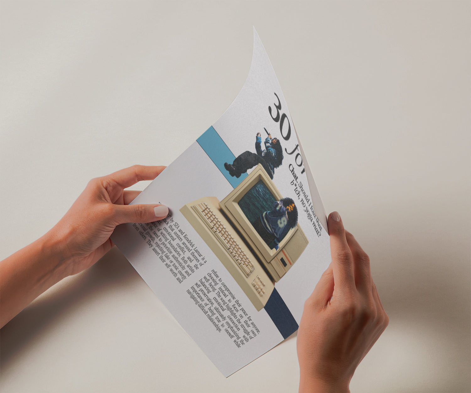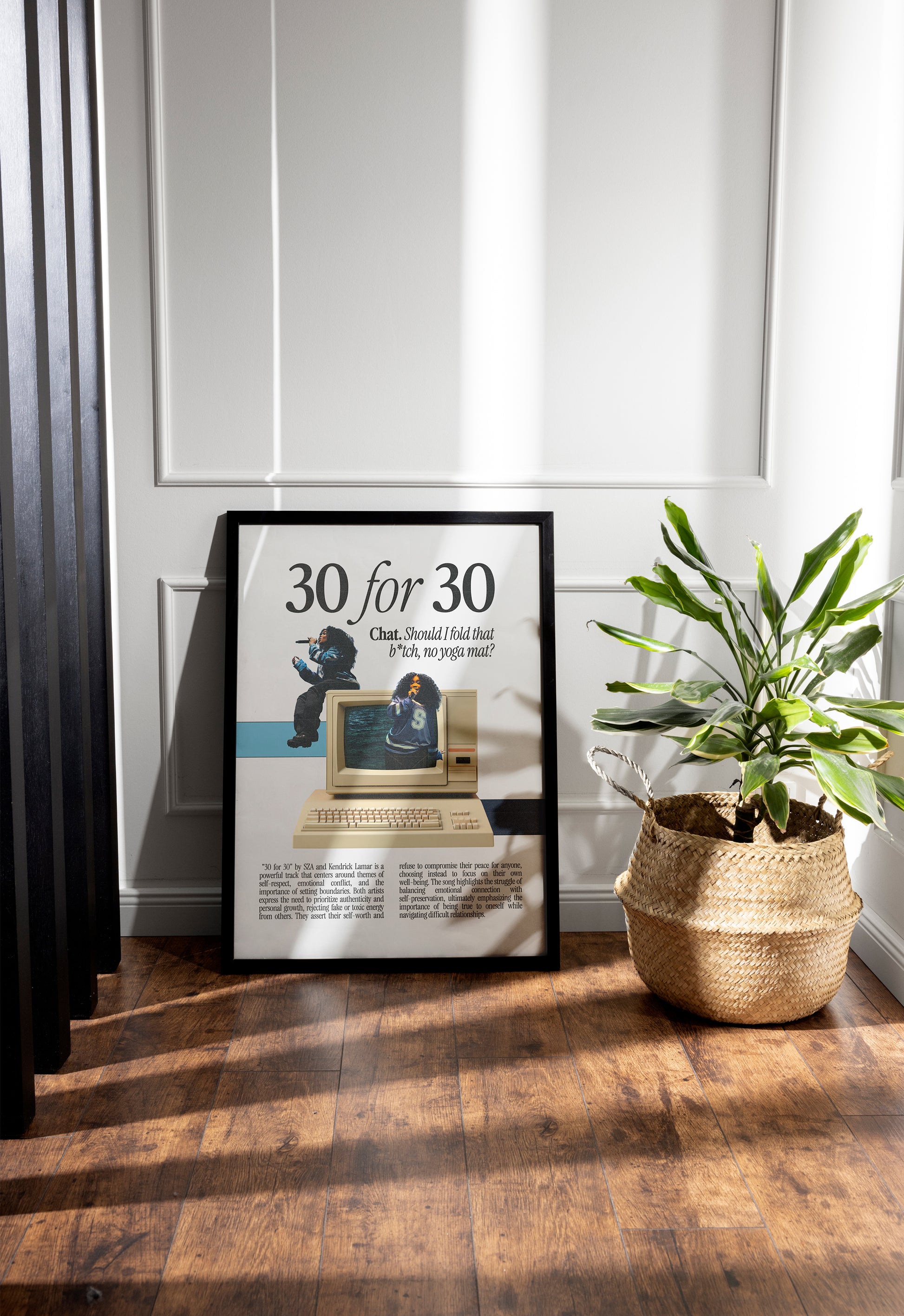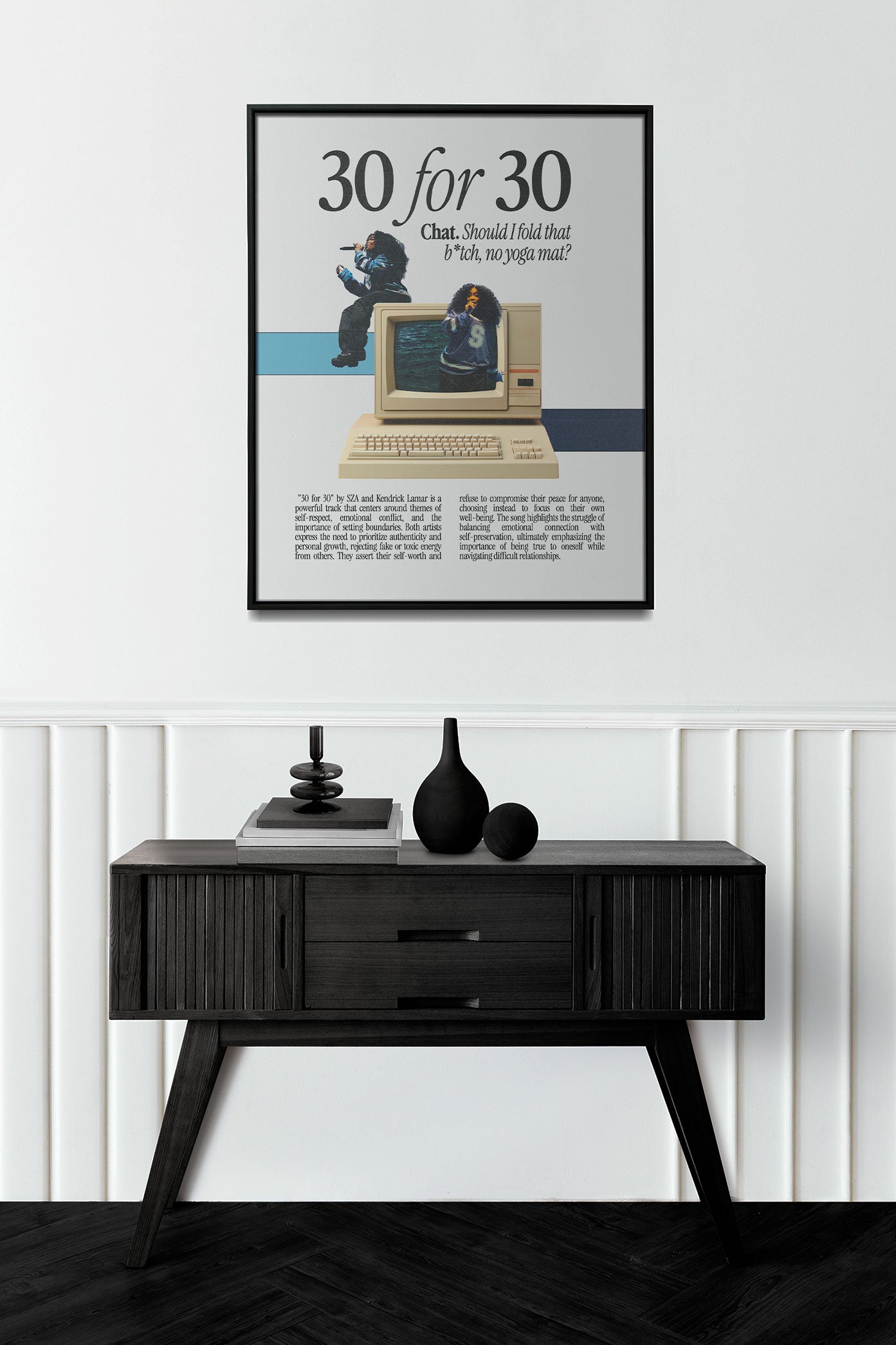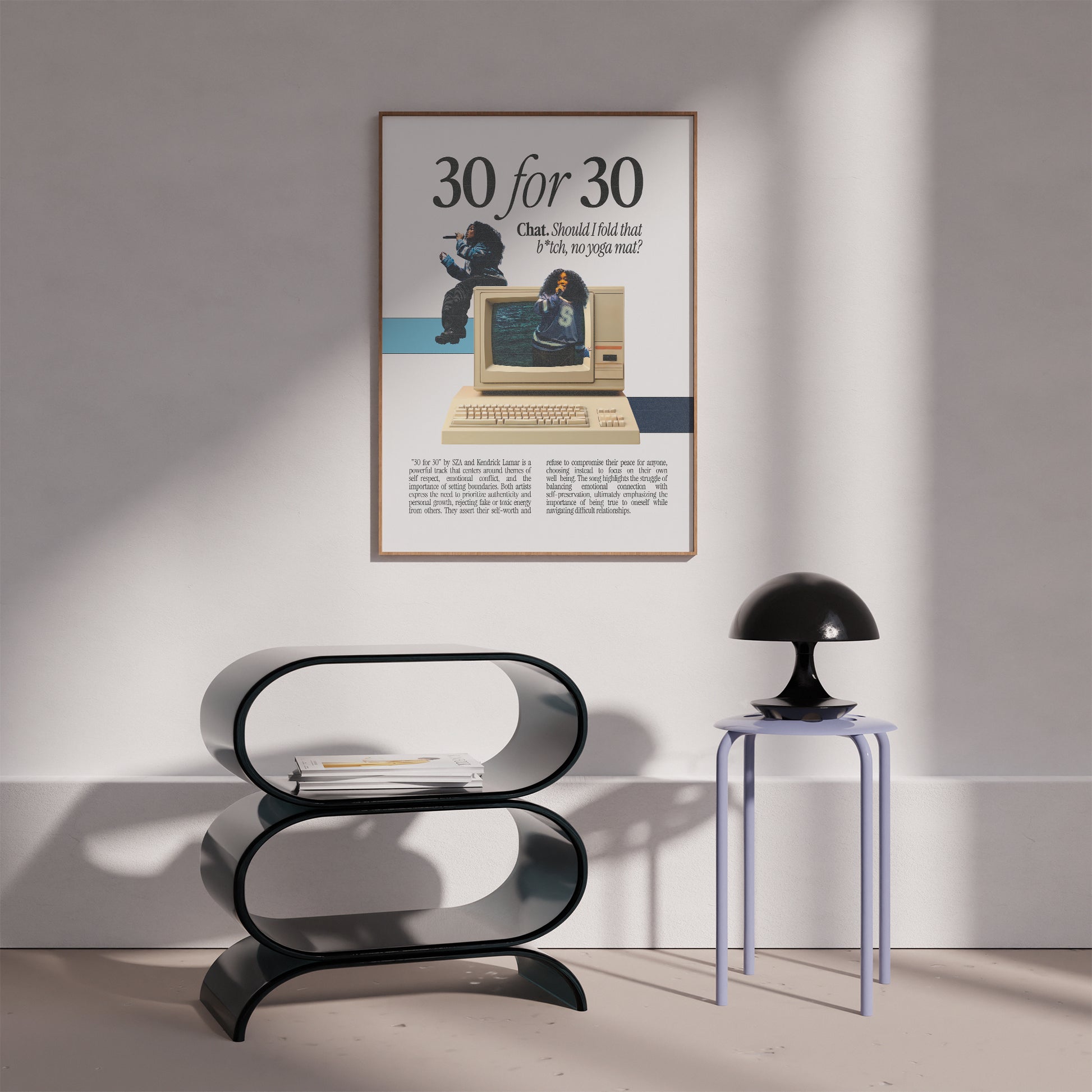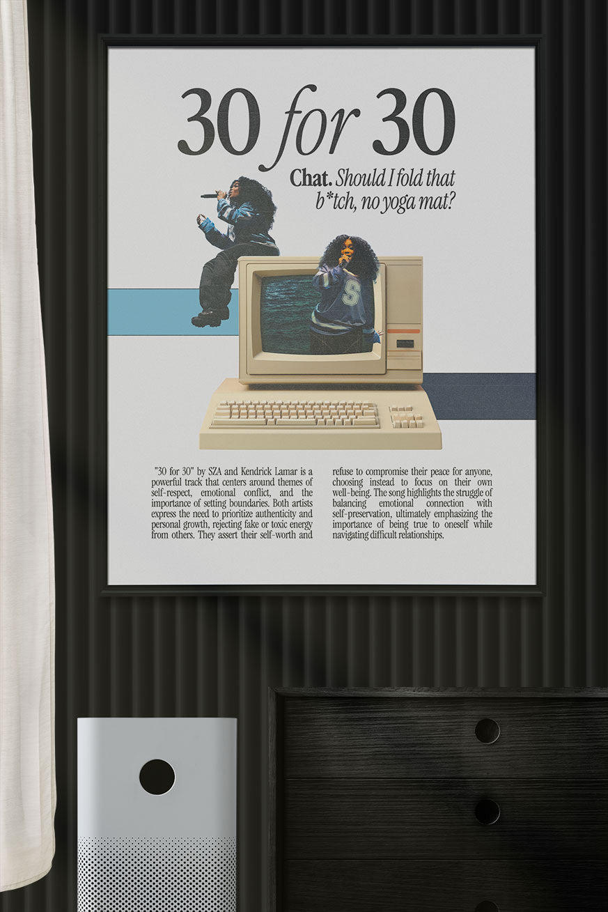 Celebrate self-worth and emotional strength with this SZA "30 for 30" Poster, featuring the lyric "Chat. Should I fold that b*tch, no yoga mat?"* and a nostalgic retro computer design. Highlighting themes of authenticity, setting boundaries, and navigating emotional conflict, this unframed SZA print is the perfect statement piece for fans of SOS and empowering music art.