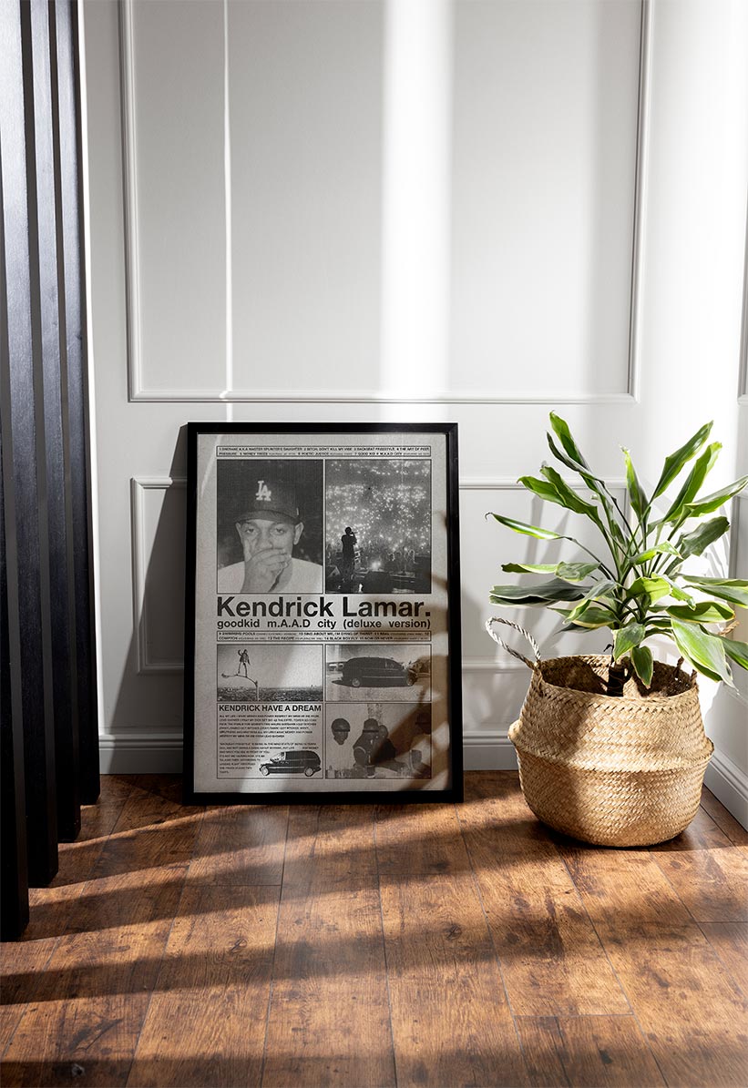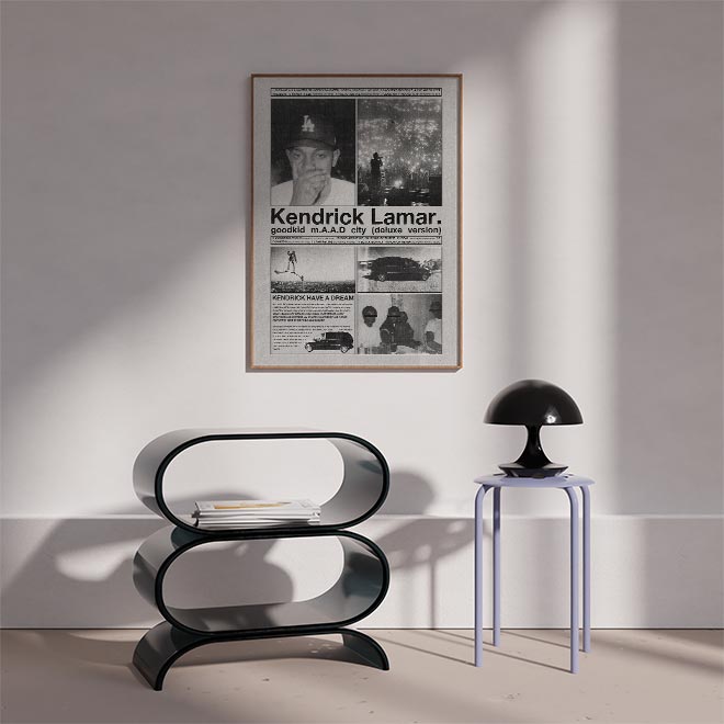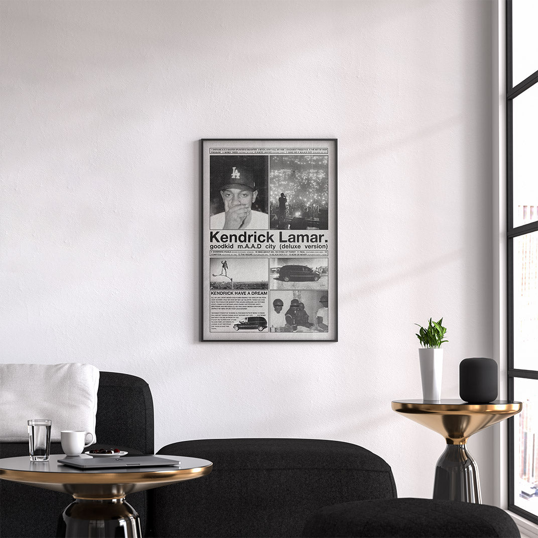 Dive into the storytelling brilliance of Kendrick Lamar with this vintage-style Good Kid, M.A.A.D City poster, featuring powerful black-and-white visuals, childhood photos, LA street imagery, and the deluxe album tracklist. A must-have music poster for true hip-hop fans, this unframed album art print captures the raw emotion and cinematic essence of Kendrick’s breakout masterpiece.