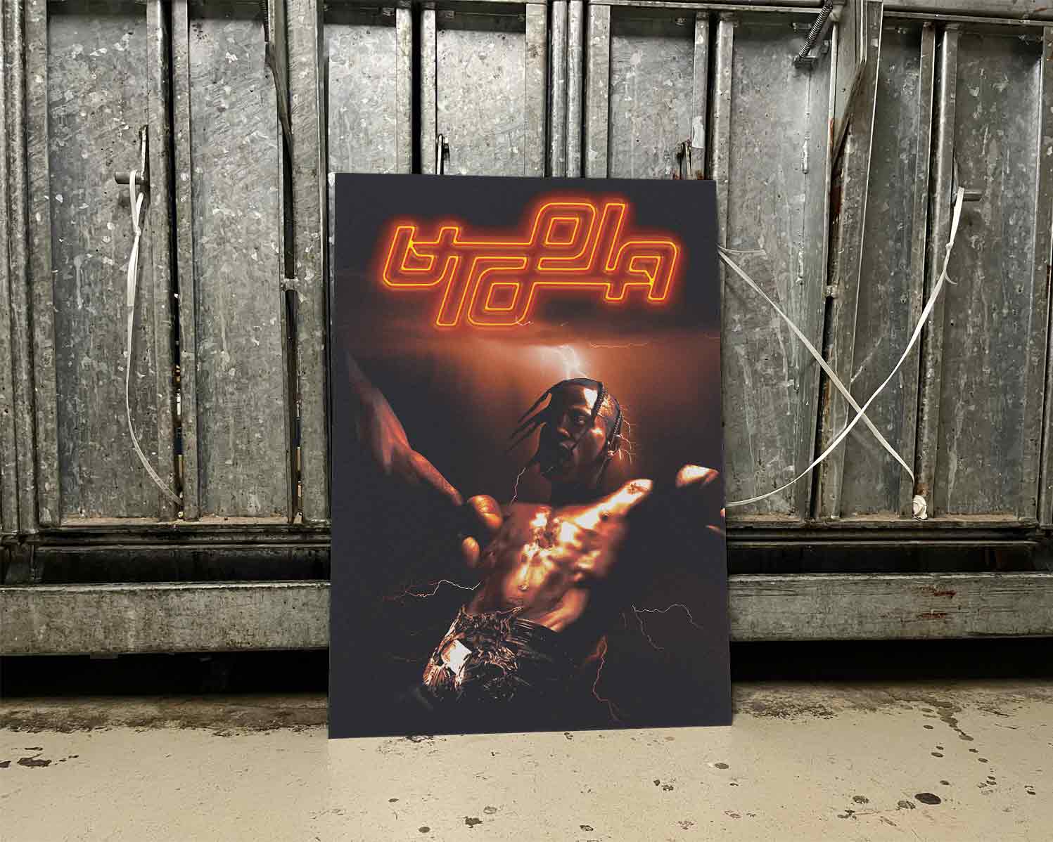 Elevate your wall with this electrifying Utopia Travis Scott poster, featuring a lightning-charged, high-contrast image of Travis in a bold, sculpted pose beneath glowing neon typography. A must-have for Cactus Jack fans and Hypebeast collectors, this unframed poster brings raw energy and futuristic vibes straight from the Utopia era into your space.