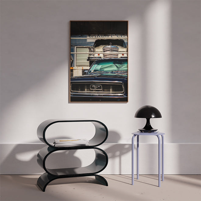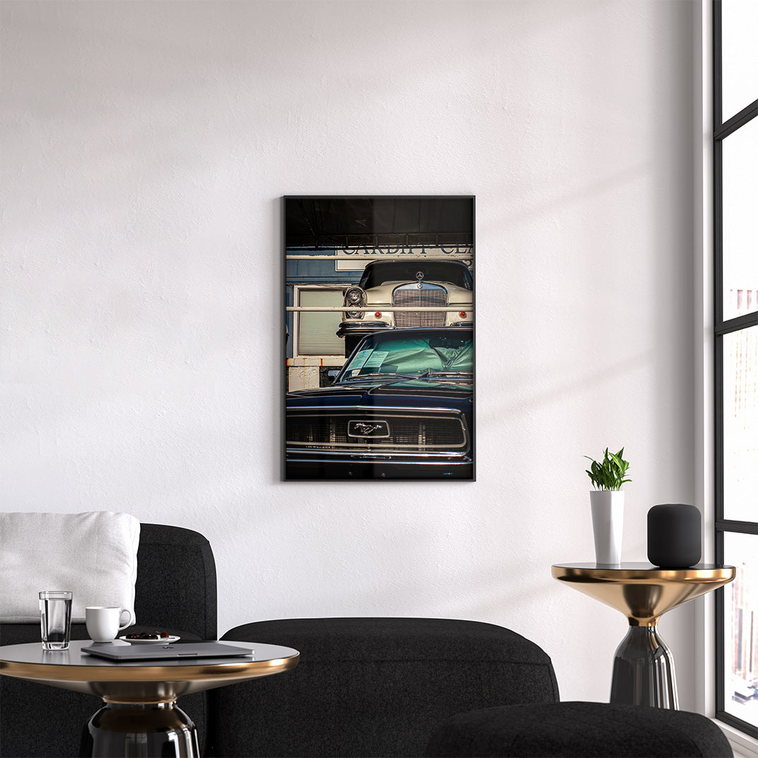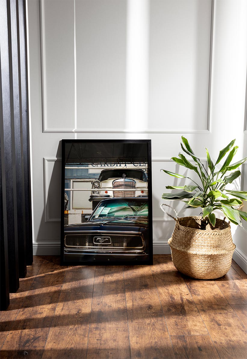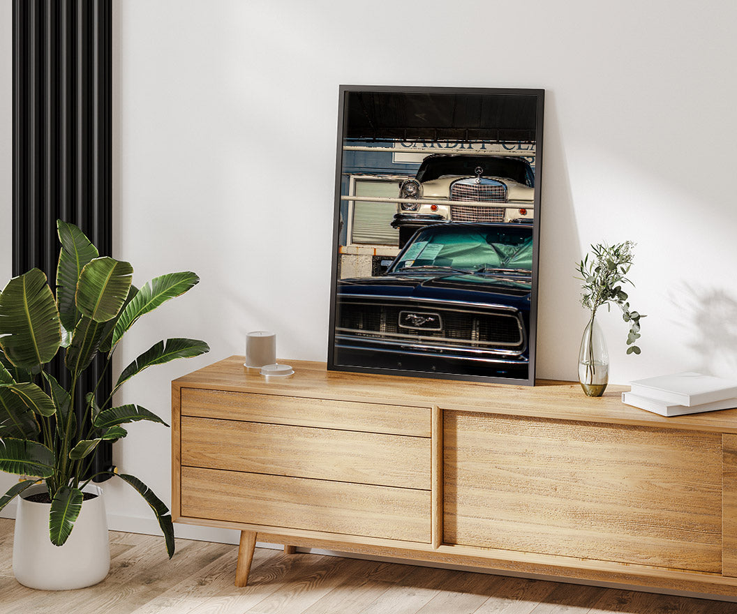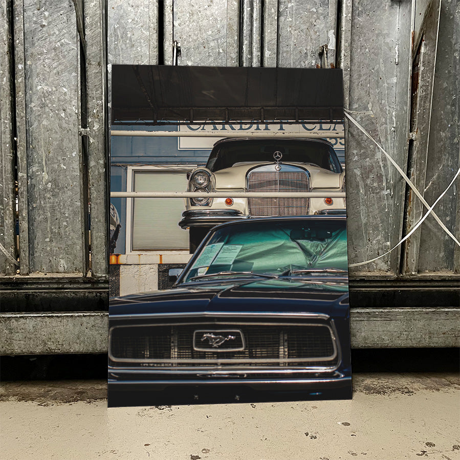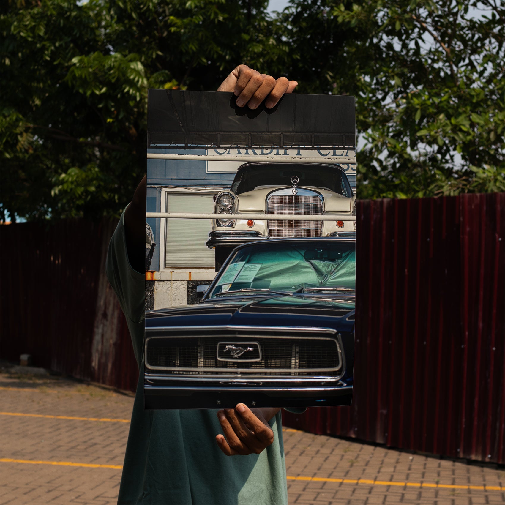 In this compelling image by Leo Rikhtman, a vintage Mercedes-Benz and classic Ford Mustang sit proudly at a Southern California dealership, evoking an era of German refined design and raw American muscle. The rich contrast between the cars' timeless lines and the weathered backdrop captures the enduring allure of automotive heritage